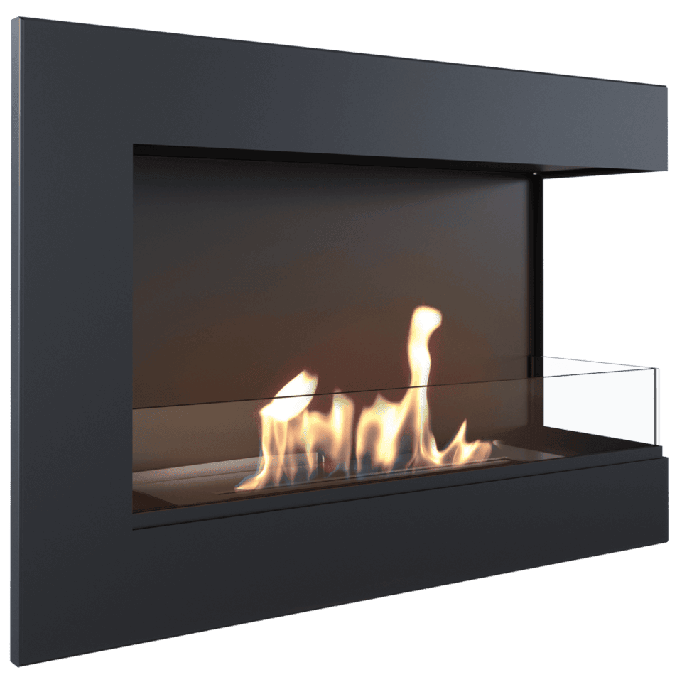 Ъгловата биоетанолова камина Delta с остъкляване, разположена отляво, е модерно устройство, което гори екологично чиста течност. Не изисква свързване към комин. Идеална е за открити пространства, където окачването ѝ в ъгъл ви позволява да се наслаждавате на гледката към огъня от две страни. Също така е идеална за свързване на помещения. Ъгловата биоетанолова камина Delta се предлага в различни дължини и със или без остъкляване, което я прави подходяща както за малки, така и за големи интериори.
