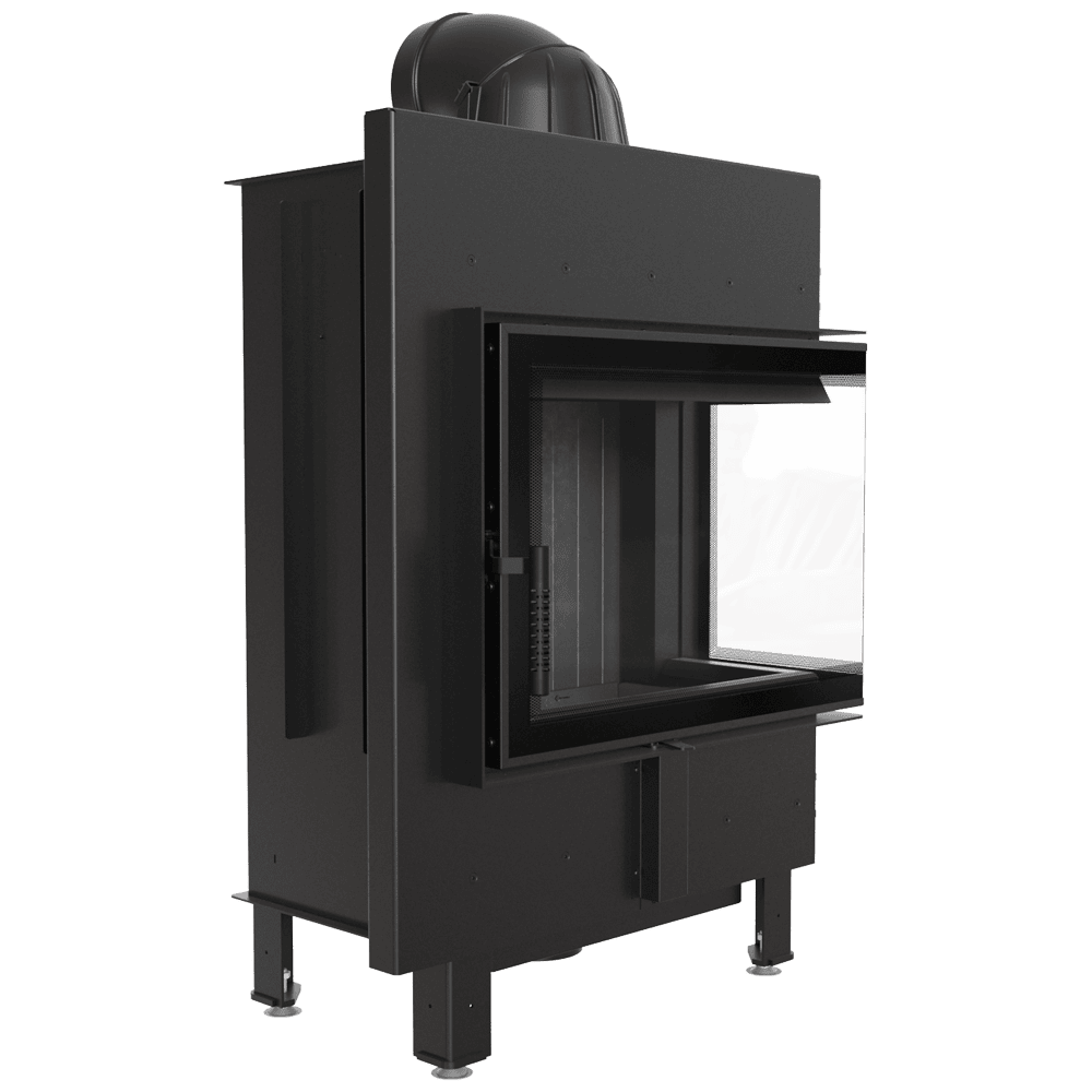 Освен това, камината използва система за чисто стъкло (въздушна завеса), което означава, че въздухът се подава директно към стъклото през система от канали, разположени отстрани на камината. Това доставя кислород до горната част на горивната камера, където газовете, получени от горенето на дърва, се изгарят, което допълнително намалява вредните емисии на CO2 в атмосферата.