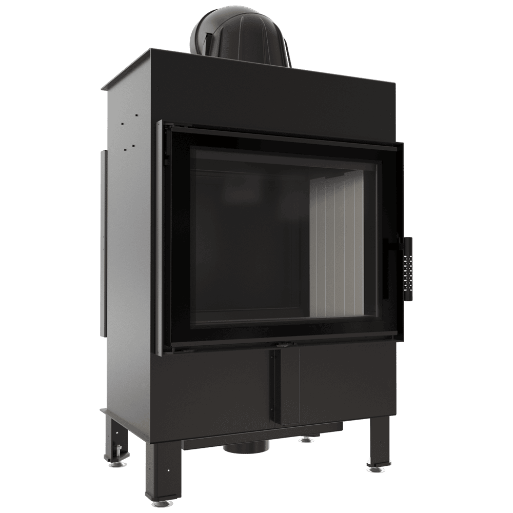 Освен това, камината използва система за чисто стъкло (въздушна завеса), което означава, че въздухът се подава директно към стъклото през система от канали, разположени отстрани на камината. Това доставя кислород до горната част на горивната камера, където газовете, получени от горенето на дърва, се изгарят, което допълнително намалява вредните емисии на CO2 в атмосферата.