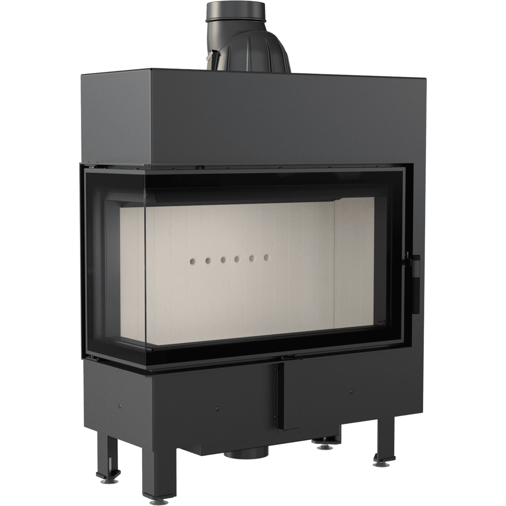 Освен това, камината използва система за чисто стъкло (въздушна завеса), което означава, че въздухът се подава директно към стъклото през система от канали, разположени отстрани на камината. Това доставя кислород до горната част на горивната камера, където газовете, получени от горенето на дърва, се изгарят, което допълнително намалява вредните емисии на CO2 в атмосферата.