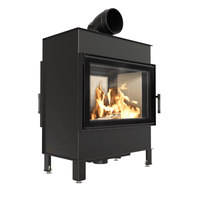 Освен това, камината използва система за чисто стъкло (въздушна завеса), което означава, че въздухът се подава директно към стъклото през система от канали, разположени отстрани на камината. Това доставя кислород до горната част на горивната камера, където газовете, получени от горенето на дърва, се изгарят, което допълнително намалява вредните емисии на CO2 в атмосферата.