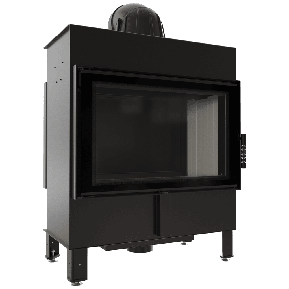 Освен това, камината използва система за чисто стъкло (въздушна завеса), което означава, че въздухът се подава директно към стъклото през система от канали, разположени отстрани на камината. Това доставя кислород до горната част на горивната камера, където газовете, получени от горенето на дърва, се изгарят, което допълнително намалява вредните емисии на CO2 в атмосферата.