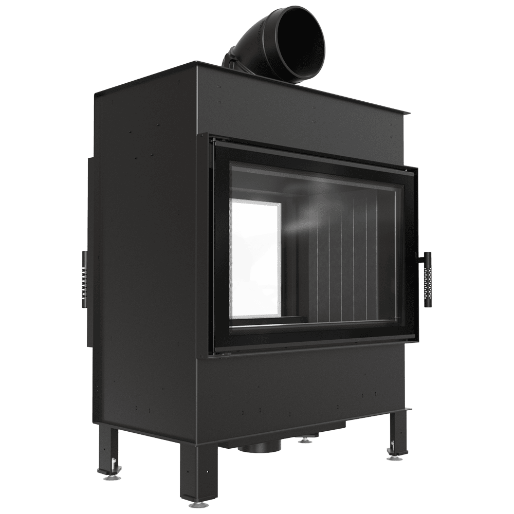Освен това, камината използва система за чисто стъкло (въздушна завеса), което означава, че въздухът се подава директно към стъклото през система от канали, разположени отстрани на камината. Това доставя кислород до горната част на горивната камера, където газовете, получени от горенето на дърва, се изгарят, което допълнително намалява вредните емисии на CO2 в атмосферата.