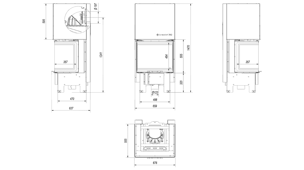 Тройна система за подаване на въздух в горивната камера: първичният въздух се насочва към горивната плоча; вторичният въздух се подава през отвори в задната стена. Освен това, камината е снабдена със система от чисто стъкло (въздушна завеса).