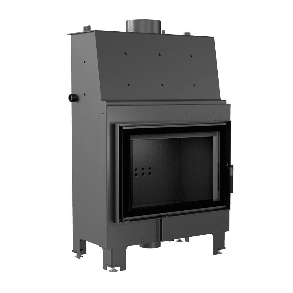 Изработена от висококачествена стомана, устойчива на много високи температури. Ефективен процес на горене и поддържане на температурата за по-дълго запазване на топлината благодарение на облицовката на горивната камера с TERMOTEC - топлоакумулиращ материал, който повишава температурата в горивната камера. Специална водна система, която позволява голямо количество топлина от димните газове да се прехвърли в отоплителната система, благодарение на което се постига висока енергийна ефективност. Защита от прегряване чрез вградената серпентина - конектор вход/изход 1/2”. Вратите на камината са устойчиви на опън и стабилни благодарение на използването на затворен профил. Уплътненията на вратата са проектирани в профилиран канал, което гарантира правилно прилепване и предпазва от евентуално падане по време на работа. По-екологично горене благодарение на двойна дефлекторна система, която удължава пътя на отработените газове. Въздух, подаван само отвън, благодарение на вграден външен вход за въздух с диаметър 125 мм с дроселна клапа. Регулиране на въздуха само с един регулатор, което предотвратява неправилна употреба. Тройна система за вентилация на горивната камера: първичен въздух - вторичен въздух, подаван под решетката през отвори в задната стена. Допълнително е проектирана система за чисто стъкло (въздушна завеса).