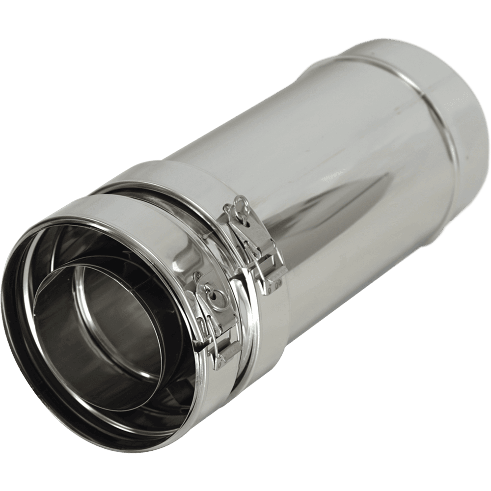 Въздушната тръба с двойна стена на концентрична система, изработена от устойчива на киселина ламарина, е проектирана за отстраняване на изпарения от устройства с газ. Bi-Gas е избрана и хидравлично оптимизирана солюция, която също има самопочистващи се свойства. Системата работи под вакуум (тя не е оборудвана с уплътнения). Характеристика: - Диаметър: 100/150 mm - Дължина: Регулируем в диапазона от 390-640 mm - Монтаж: само хоризонтален сглобяване - Температурно съпротивление: 600 ° C - оборудван с закрепващи скоби - тествани в Ceric - Материал: Неръждаема стомана (Austenitic) 1.4404 вътре, (316L, L50), 1.4301 външен L20.