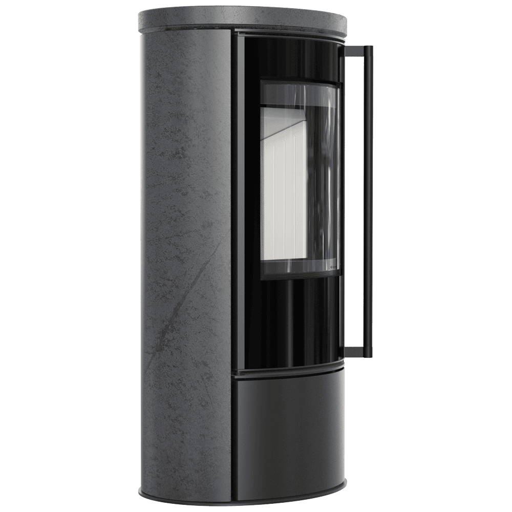 Стоманена печка на дърва Kratki ERIK/GFS/P/BA1 Ø 150 5.5 kW, декоративна керамика Grafite Satin, Керамичен капак, Черна стоманена дръжка, самозатваряща се