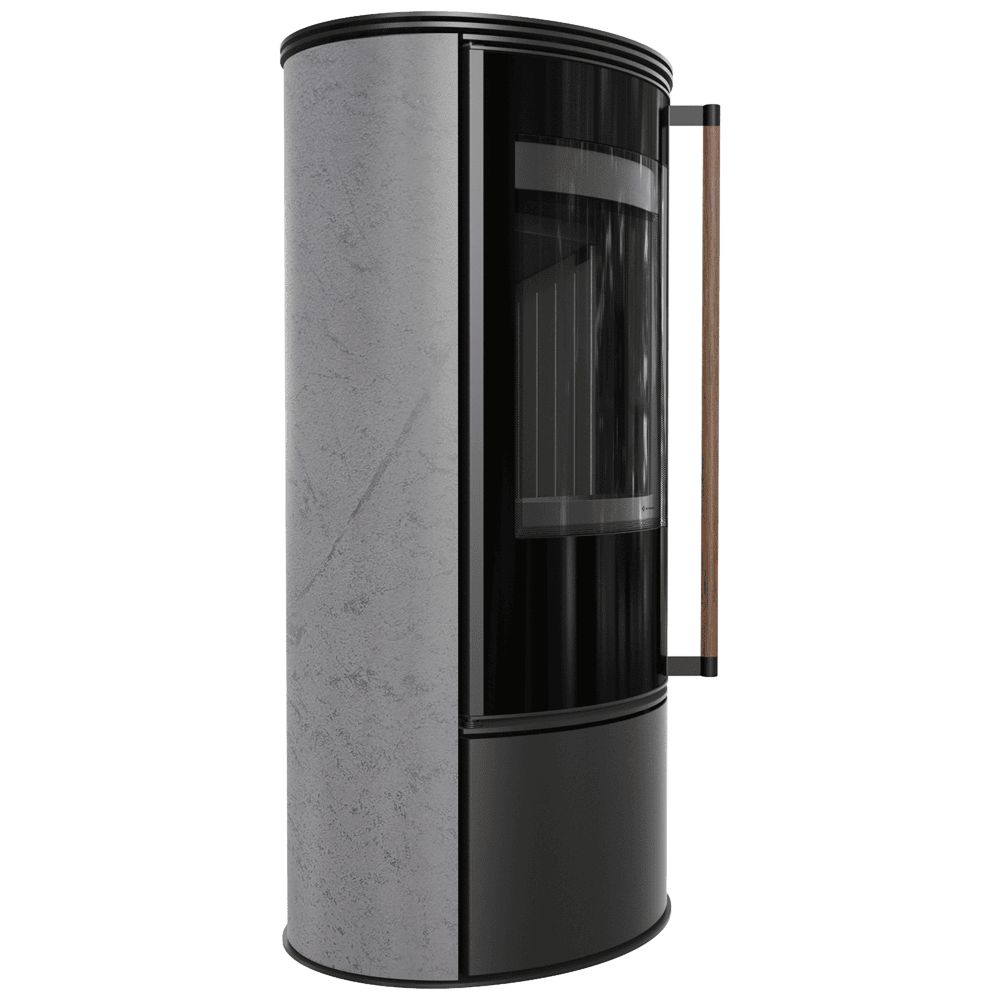 Стоманена печка на дърва Kratki ERIK/GS/P/BLACK/KDJ/BA1 Ø 150 5.5 kW, декоративна керамика Grey Satin, black thermotec, Керамичен капак, Дръжка от екзотично дърво Jatoba, самозатваряща се103.9 смСтоманен фронт с огънато декоративно стъкло150извитаGrey SatinДа5.5Вход за въздух - вграден, пепелник, облицовка на горивната камера, декоративно стъклоblack thermotec