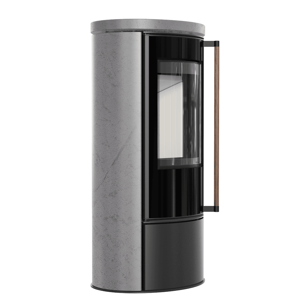 Стоманена печка на дърва Kratki ERIK/GS/P/KDJ/BA1 Ø 150 5.5 kW, декоративна керамика Grey Satin, Керамичен капак, Дръжка от екзотично дърво Jatoba, самозатваряща се