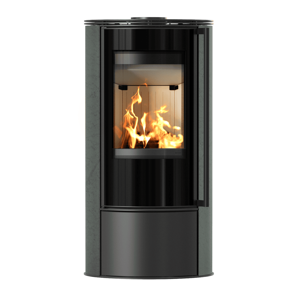 Стоманена печка на дърва Kratki ERIK/SPT Ø 150 5.5 kW, декоративна керамика Serpentino, стоманен капак, Черна стоманена дръжка