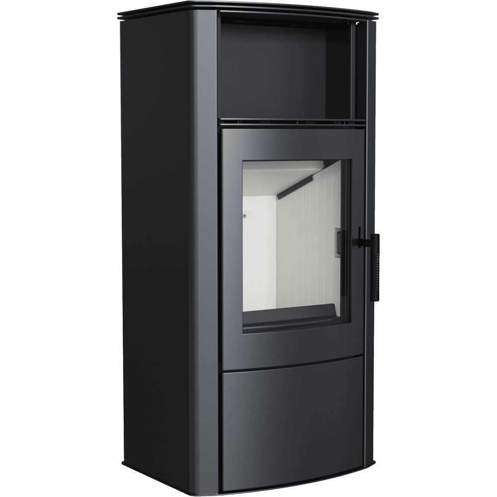 Освен това, печката е снабдена със система за чисто стъкло (въздушна завеса), което означава, че въздухът се подава директно към стъклото през система от канали, разположени отстрани на камината. Това доставя кислород до горната част на горивната камера, където се изгарят газовете, получени от горенето на дърва, което допълнително намалява вредните емисии на CO2 в атмосферата.