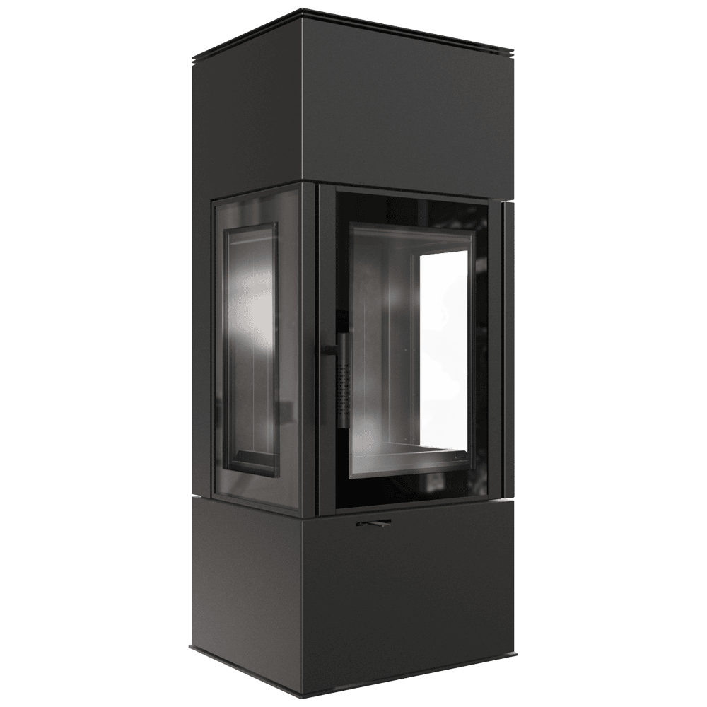 Тристранното остъкляване подобрява гледката към огъня, а допълнителното декоративно стъкло подчертава чара му. Вътрешната облицовка на печката с TERMOTEC контрастира красиво с екстериора, придавайки на цялата печка модерен вид.