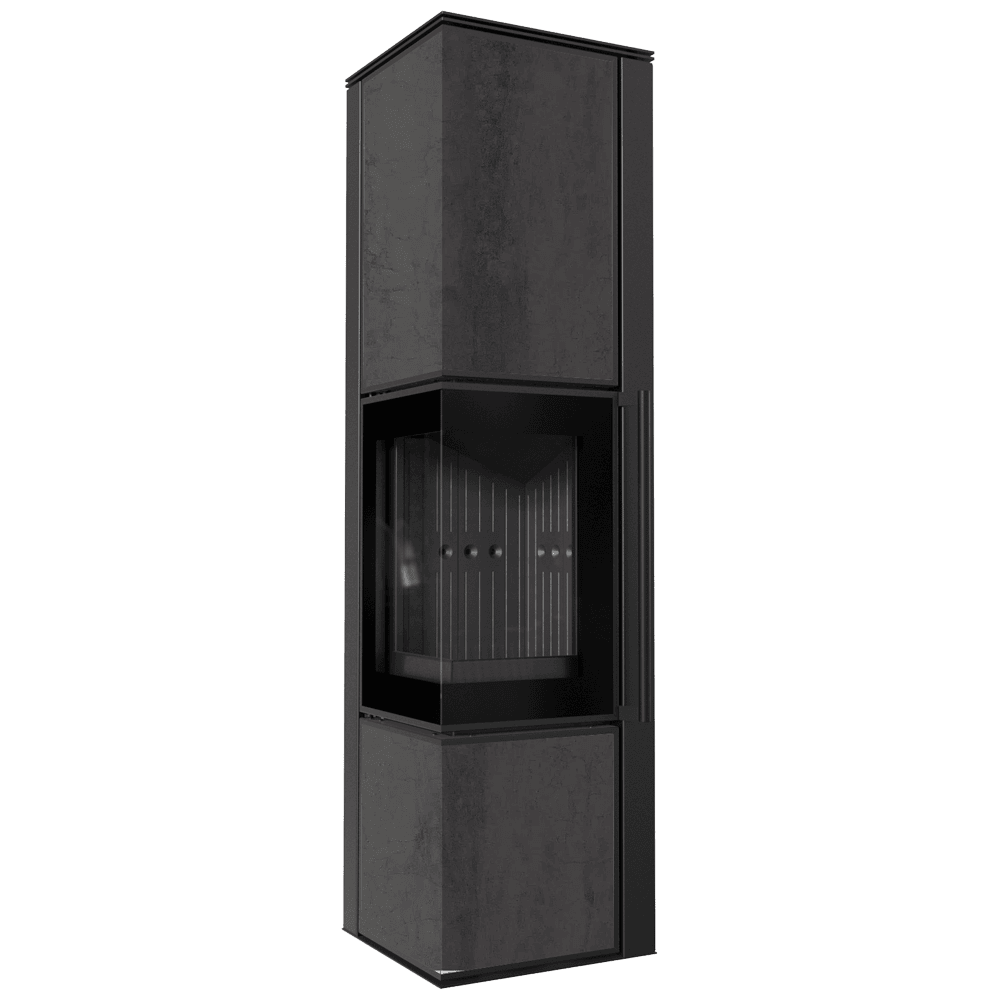 Стоманена печка на дърва Kratki TORA/S/BLACK/Q/N/P/D/S/A/B Ø 150 8 kW, с кварцов синтер NATURALI PIETRA DI SAVOIA ANTRANCITE BOCCIARDATA, black thermotecSize SСтоманен фронт с керамично стъкло150ъглова дяснаPietra Di Savoia AntraciteНе8Вход за въздух - вграден, пепелник, облицовка на горивната камера, декоративно стъклоblack thermotec