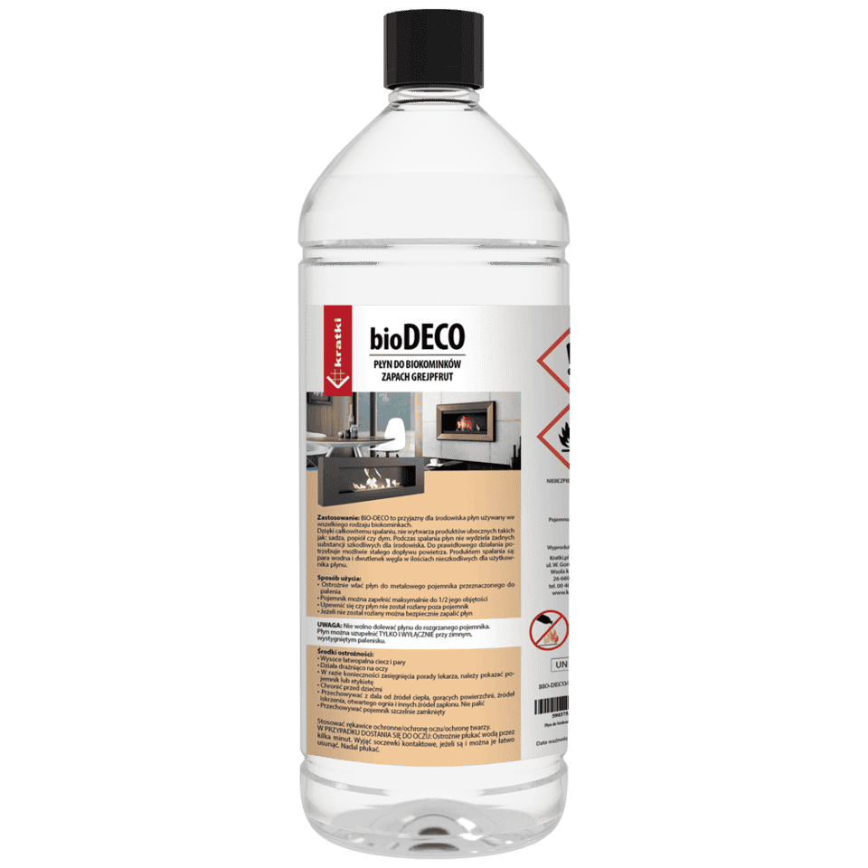 Специална течност с аромат на грейпфрут, предназначена за употреба в камини като екологичен източник на енергия. Получена от биологичен алкохол, тя изгаря напълно, без да отделя нито миризма, нито дим. Продуктите от горенето включват водна пара и въглероден диоксид в количества, подобни на издишания въздух. Следователно е напълно безопасна за здравето. Един литър биогориво гори в продължение на 2-5 часа, в зависимост от размера на пламъка. Това е ефикасен и сравнително евтин източник на енергия. Само след няколко минути употреба се усеща значително повишаване на температурата в помещението. Допълнително предимство на биогоривото е липсата на сажди или пепел, които се произвеждат при горене в традиционните камини. Изгарянето на биогориво не изисква специални димоотводи за камина. Изисква се само – както при други устройства с открит пламък – постоянно подаване на въздух. Биогорива с това устройство може да се използва и за ароматерапия. Биогоривото не изсушава въздуха, а го овлажнява. Чрез добавяне на ароматни масла можем да използваме биокамина като терапевтично устройство. Магията и очарованието на огъня в камината създават уютна атмосфера в дома и са източник на релаксация. Това биогориво е полски продукт, 100% екологичен. Предлага се в контейнери от 1 литър. НАЧИН НА УПОТРЕБА: Изсипете течността в метален съд, предназначен за горене. Напълнете съда само до 2/3 от обема му. Уверете се, че течността не е излята извън съда, преди да запалите. ПРЕДУПРЕЖДЕНИЕ: Не добавяйте биогориво към горяща биокамина.